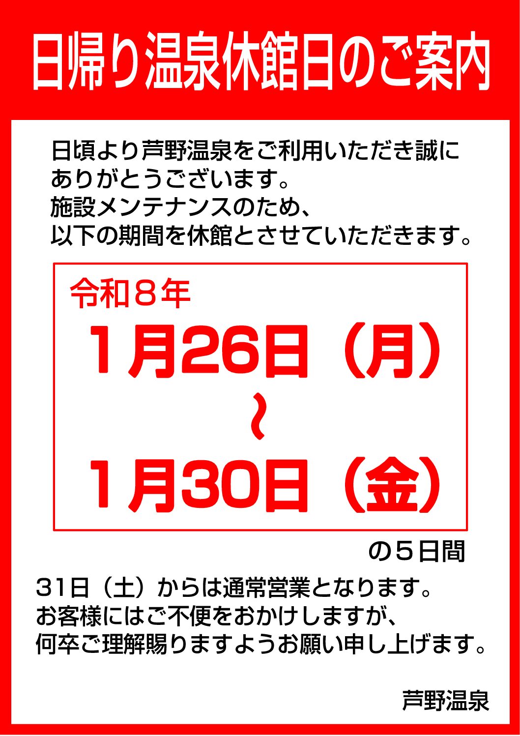 ●日帰り温泉休館日: 2026年1月26日(月)~1月30日(金)